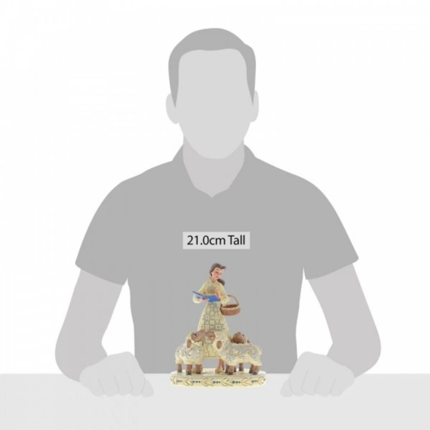 Daydream away with this imaginative, brave beauty designed by Jim Shore. In this lovely White Woodland piece, Belle from Beauty and the Beast tells tales of romance and far-off adventure to her sheep friends, not knowing she will soon find love on her own enchanting journey.