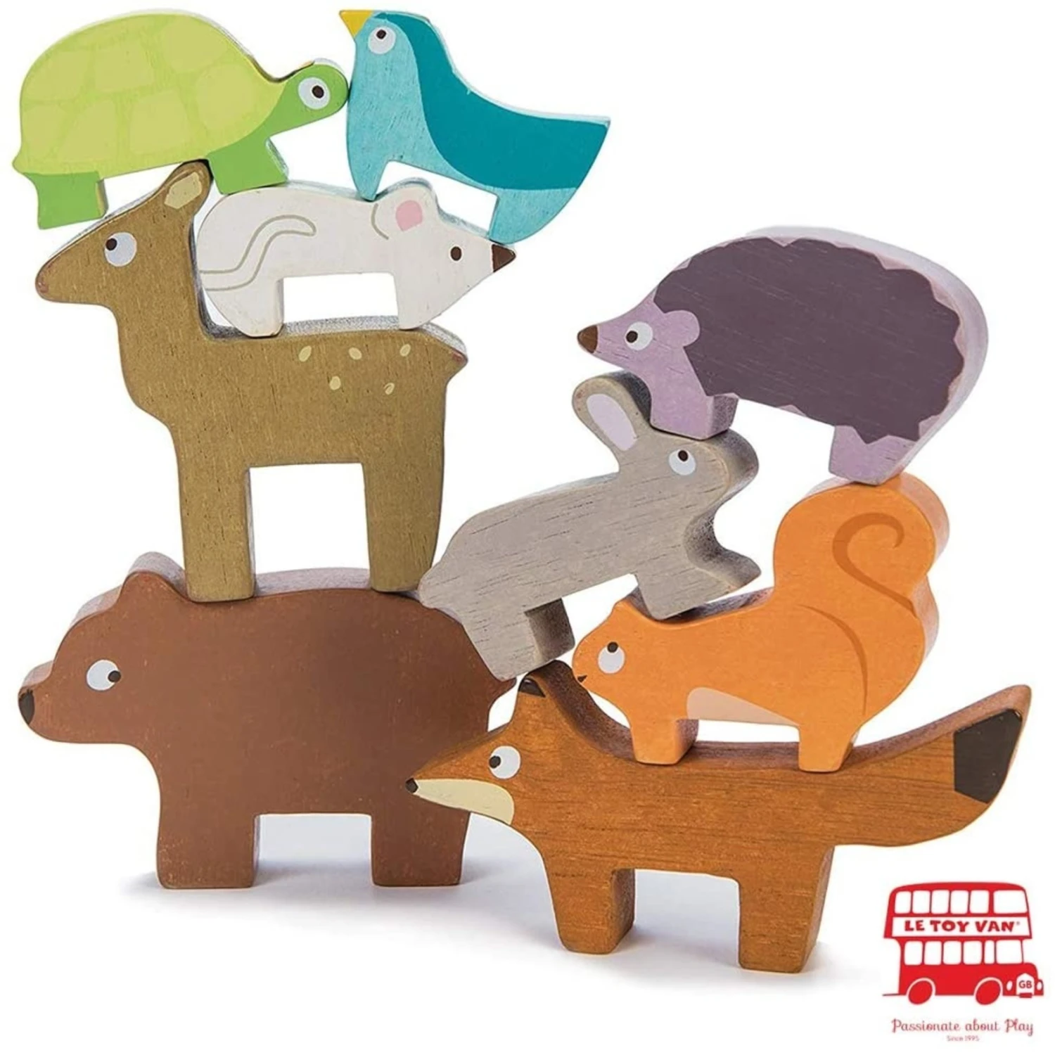 Who can stack the animals the highest before they tumble down? A set of 9 wooden stacking animals complete with handy draw string bag to play anywhere. The woodland animals are made of solid wood ethically made from sustainable legal wood and the set is entirely plastic free! A fantastic gift for toddler! Safely tested for children from 18 months+.