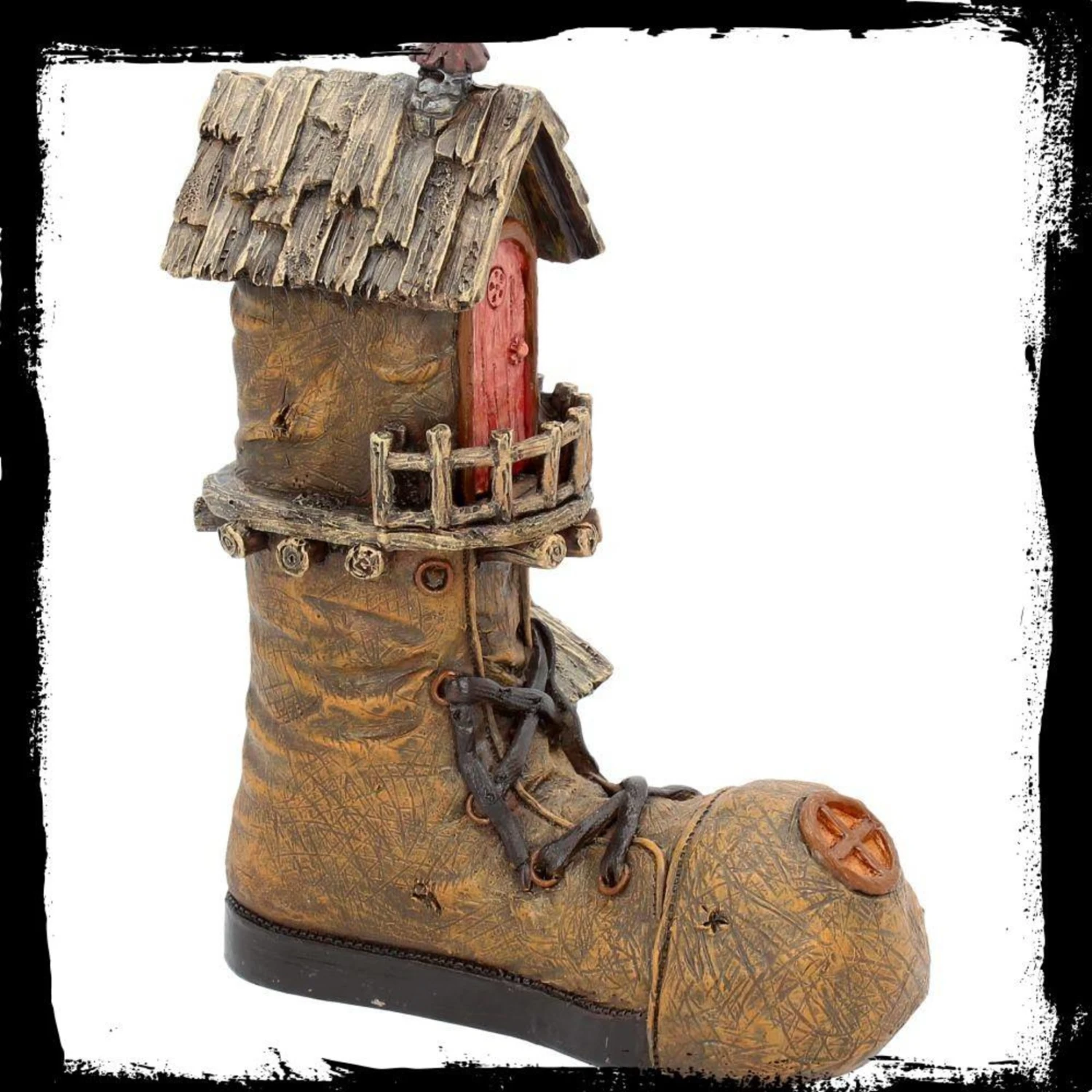 Standing at around 18cm tall this now converted fairy home has a little red door with a porch at the heel of the boot and a small red door near the top with a little balcony, with two windows, a wooden style shingle roof and climbing ivy this dwelling make a lovely home sweet home.
