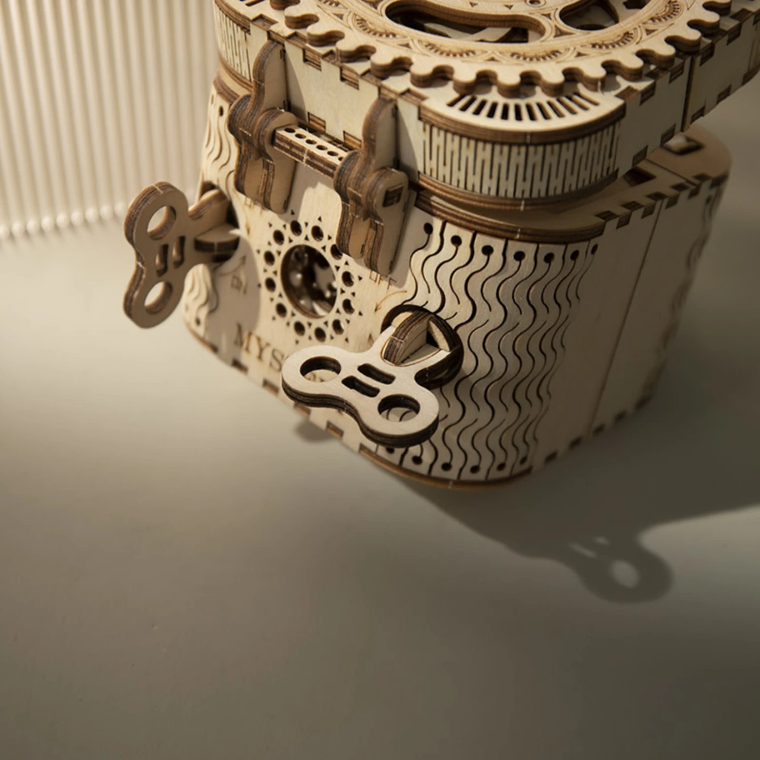 A creative treasure box with secret compartment, combination lock and moving gear cover.